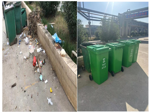11月,生产部现场改善小组在卫生检查时,经常发现有员工将垃圾扔到盐水垃圾桶摆放处的花坛上和旁边的空地。车间员工反映,保洁公司来托运垃圾的时间间隔过长,垃圾桶装不下了才迫不得已丢到周围地下。现场改善小组第一时间与保洁公司沟通,将垃圾托运时间间隔调整为一周三次,并且立即上报增设垃圾桶的需求。在12月初垃圾桶采购入厂后,及时投入使用。目前盐水工区旁垃圾存放处已将破损的两个垃圾桶更换,同时新增了三个垃圾桶,极大地缓解了垃圾储存的压力。