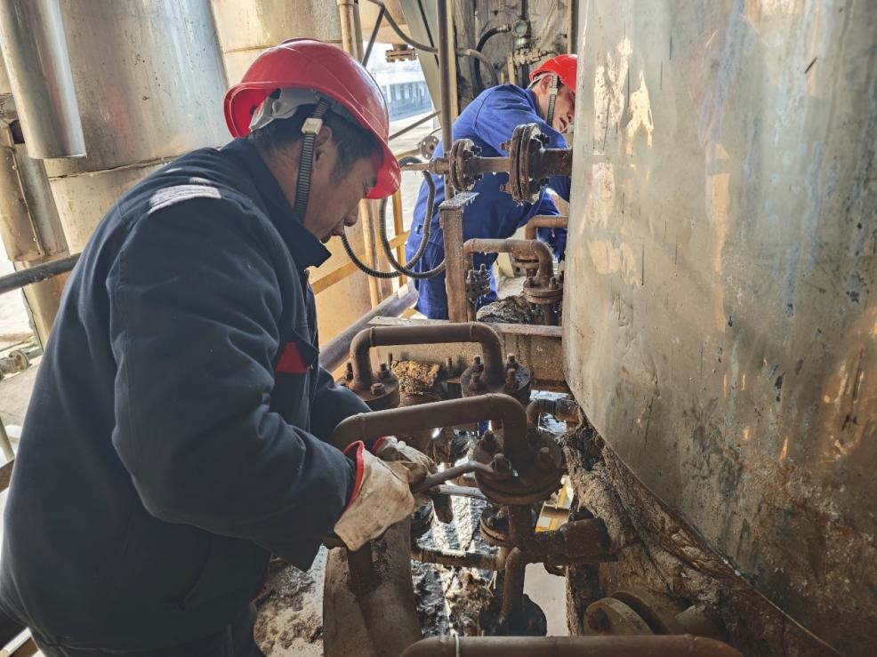 车间职工不畏严寒,为了能在年前把车开好、开平稳,个个都铆足了干劲。由于气温较低,不少管件都上了冻,为了能顺利拆卸安装,现场人员用蒸汽吹扫上冻的零部件,不放过任何一个需要检修的地方。绝不因为气温过低就缩手缩脚,反而是采用一切能用的办法克服困难——阀门管件上冻就用蒸汽吹,新水自来水管上冻了就用循环水……