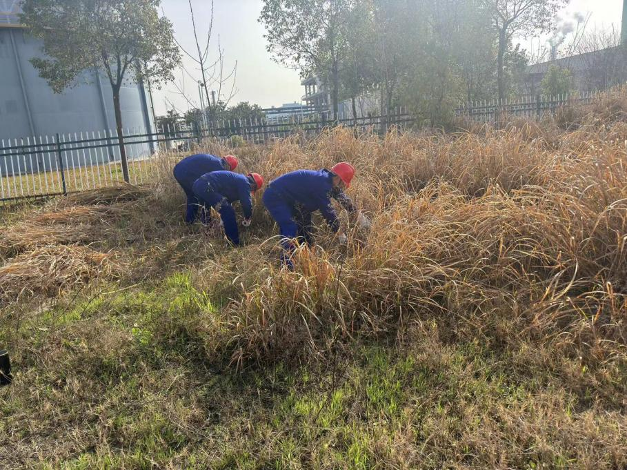 各班组人员快速行动起来,投身到杂草清理工作中去。但由于受到场地限制,无法利用机械设备除草,只能人工作业。“老贾,你力气大,你铲草,我把草拢在一块堆放路边方便清运。”杨世忠说道。“没问题!这样分工合作效率高”说罢,老贾顾不上擦脸上的汗水,埋头加快了进度。