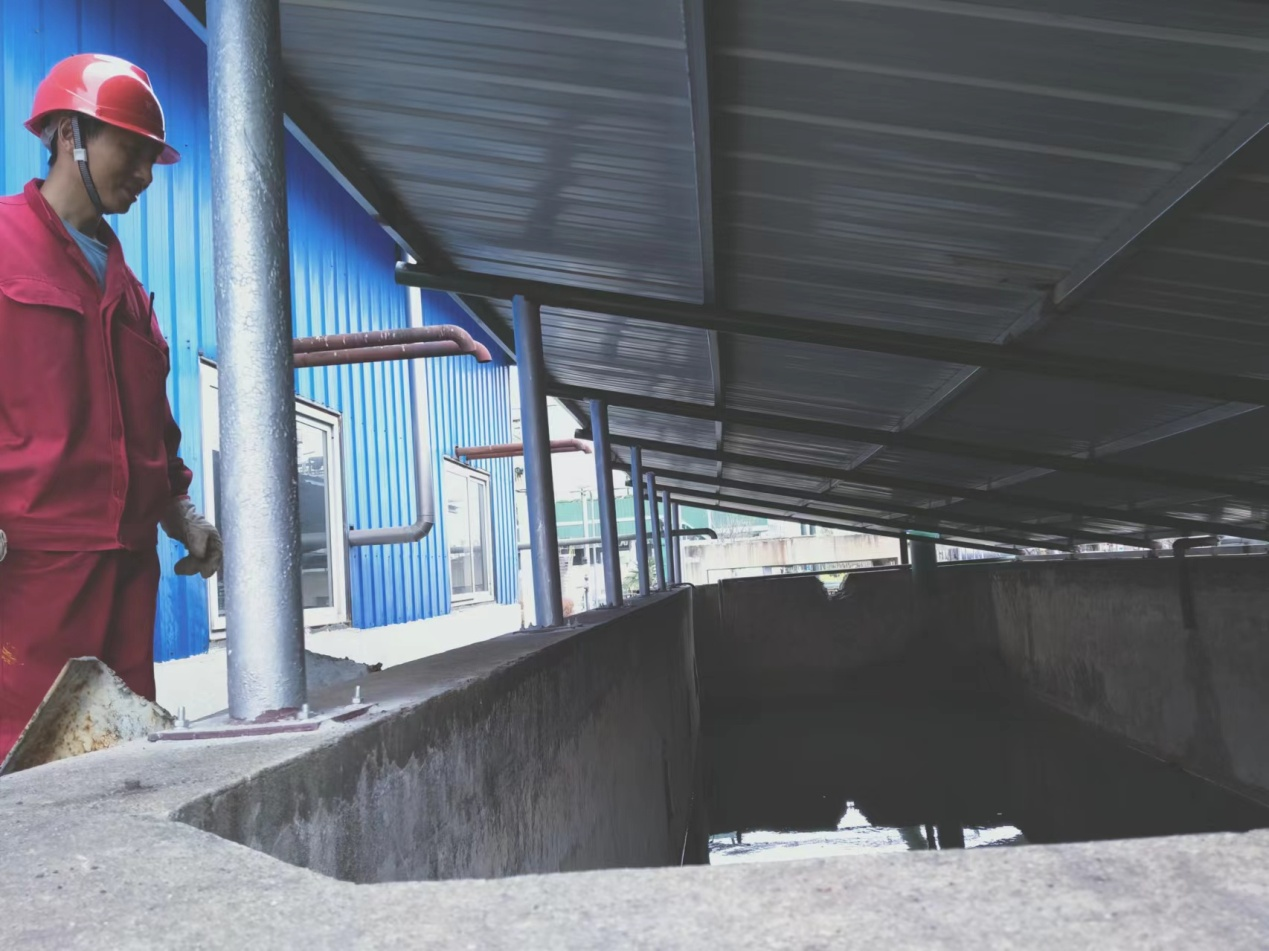 图为当班操作工王顺华检查回收水池内水的澄清情况