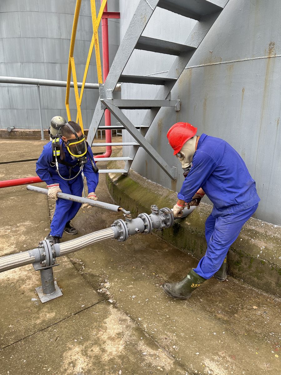 本次演练活动预设为加氢车间现场操作人员兰世杰在生产巡检过程中发现邻甲罐V-3141出口第一道阀门泄露邻甲,经查发现阀门垫片泄露严重,立即用对讲机向当班调度朱洪涛汇报险情。“立即启动应急预案,必须将险情控制在萌芽状态!”随着调度一声令下,各参演人员迅速进入演练状态,现场操作人员陈洪山、刘泽军立即检查并关闭所在储罐区围堰的出口阀门;肖世华、周多兵穿戴好空气呼吸器赶赴泄露现场关闭第一道出口阀,更换泄露的阀门垫片,就近开启室外消火栓对泄漏点实施喷淋稀释物料;分析人员段堂娟进行气体及水体监测分析,消除事故隐患。