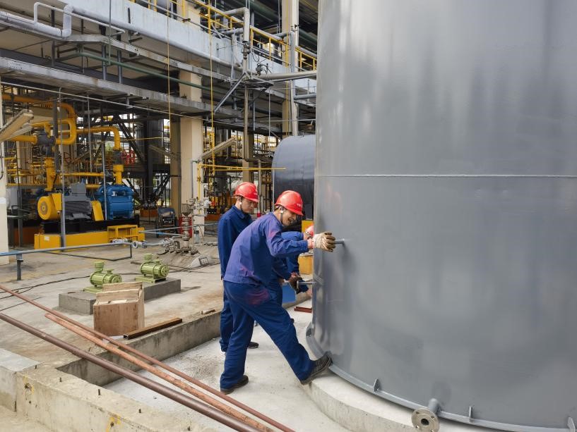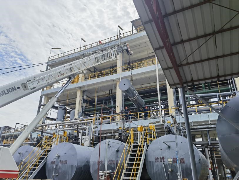 “往东边一点”、“顺时针转一下”、“好,好,看下管口方位对不对……”随着现场井然有序的指挥,二期改造新增加的邻硝中间罐和粗品罐被安全平稳地放在了设备基础上。分层器和触媒沉降槽则是要分别吊装到装置二楼和三楼平台上,众人操作格外小心,每次起吊都要确认拴紧吊装带,安好挂钩,控制好起重臂与装置之间的距离。在众人齐心协力的努力下,顺利完成了四台新设备的吊装。
